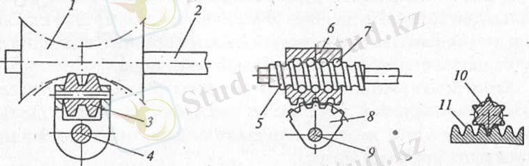 Руль механизмі. а-бцрамдыц-роликті, б-бцрама-рейкалы, в-рейкалы, 1 -бцрамдың, 2, 4, 9-біліктер, 3-ролик, 5-бцрама, 6-шарикті гайка-рейка, 7-шариктер, 8-тісті сектор, 10-шестерня, 11 -рейка