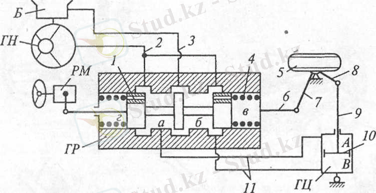 Гидравликалық күшейткіш құрамына гидросорғы-ГС, бак-Б, гидротаратқыш-ГТ және гидроцилиндр кіреді. Рульдік механизм-РМ гидротаратңыштың-ГТ золотнигіне әсер етеді. Рульді бүрған кезде золотник сорғыдан-ГСкелетінмайды -ГЦ жеткізеді. Поршень тартқыш аркылы баскарушы доңғалақты бүрады, тартңыш гидротаратқыш-ГТ корпусын жылжытып, золотникті бастапқы қалпына келтіреді, гидротаратқыштан-ГТ майды гидроцилиндрге-Щ беру және доңғалақтың бұрылуы тыйылады.