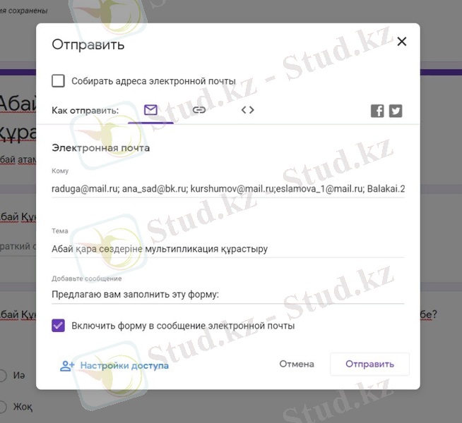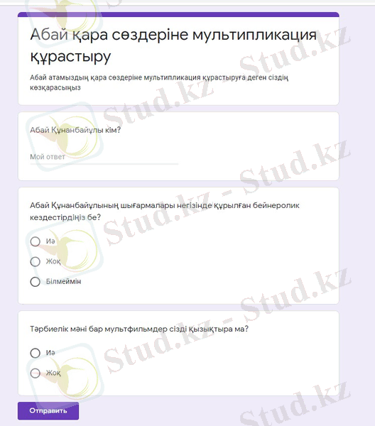 Сауалнама Google Forms платформасында (1-сурет) құрылды. Төмендегі сілтеме оқушылар мен балабақша тәрбиешілеріне ұсынылды (2-сурет) .