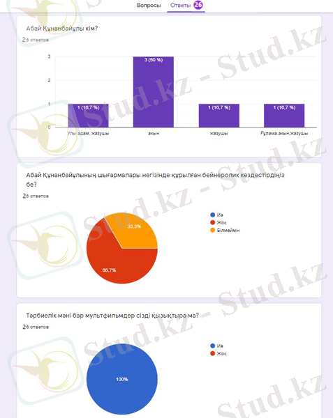 Сауалнама қорытындысы бойынша үшінші негізгі сұраққа («Тәрбиелік мәні бар мультфильмдер сізді қызықтыра ма?») барлық қатысушылар 100% «Иә» деп жауап берген (3-сурет) .