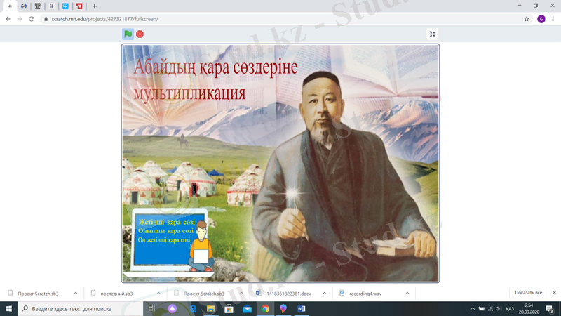 Жұмыстың өзектілігі: Абай Құнанбайұлының қара сөздерінен SCRATCH бағдарламасында мультипликация құрастырып, мектеп жасына дейінгі балаларға және бастауыш сынып оқушыларына (мектепалды даярлық, 1-2 сынып) ұлы жазушының шығармаларын дәріптеу.