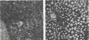 Бүйректе тік ішек түтікшелерінің басым зақымдануымен майлы инфильтрацияның дамуы тән, ол көбінесе түйіршікті дистрофиямен біріктіріледі. Гликогеннің аз мөлшерін түтікшелі эпителий цитоплазмасында, әсіресе Генльдің ілмектерінде кездестіруге болады. Жүрекішілік жүйке жүйесінің тотальды хроматолиз және нейронофагия белгілері бар қатты зақымданулары бар. Нерв талшықтарында - варикозды қоюлану, фрагментация, ал Пуркиннің талшықтарында - майға жағымды боялған бірнеше вакуоль. Асқазанның миокардында тамырлардың бұзылуы және дистрофиялық өзгерістер - семіздік, бұлшықет талшықтарының атрофиясы, майлы және түйіршікті деградация. Қаңқа бұлшықетінің өзгеруі.