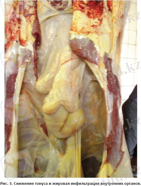 Кесілген лимфа түйіндері шырынды, сұрғылт, көбінесе аздап үлкейген. Көкбауыр көрінетін өзгерістерсіз. Провентрикулада клиникалық айқын атониясы бар күйіс қайыратын жануарлар кітабында жемшөп массалары құрғақ және тығыз. Іштің абомазиясында, ішектің ұсақ және ірі бөліктерінде, шырышты қабығының аздап ісінуі, тоқырау көптігі құбылысы, ішекте өткір катаральды белгілер жиі байқалады. Жатыр субинволюция жағдайында, аналық безде дисфункция бар. Бүйрек үсті бездерінде кортикальды қабат анағұрлым дамыған және сұр-сарғыш түске боялған, мүшенің паренхимасы ақшыл болады.
