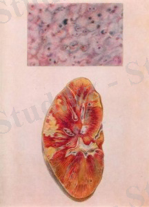 Паренхиматозды органдарда, әсіресе бауырда, бүйректе (түсті кесте. XII - А) және жүректе айқын дистрофиялық және гемодинамикалық өзгерістер анықталады. Бауыр көлемі жағынан айтарлықтай жоғарылайды (кейде 1, 5-2 есе), ақшыл консистенциясы, сарғыш-сарғыш түсті. Мүшенің кесілген беті майлы болып келеді. Бүйректің мөлшері, ереже бойынша, үлкейген, қабаттар арасындағы шекаралар айқын көрсетілмеген, кеңейтілген қабық сарғыш реңкпен. Медуллада тамырлар қанға толып кетеді. Эпикардий астында, жүрек түбінде, коронарлық тамырлардың бойында айтарлықтай май шөгінділері бар. Миокард әр түрлі дәрежеде қарыншалардың ақырын, анемиялық, миогендік кеңеюі болып табылады.