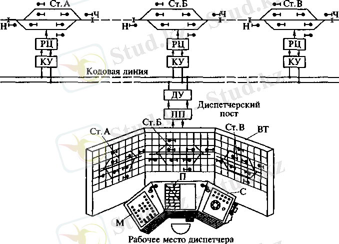 Басқару сигналдары КУ әрбір аралық станциясында қабылданады және одан әрі РЦ бағыттамалары мен сигналдарын релелік орталықтандыру аппаратурасына түседі. А-В-станциялар, Н-тақ кіру бағдаршамдары, Ч-жұп кіру бағдаршамдары, РЦ -бағыттамалар мен сигналдардың релелік орталықтандыру аппаратурасы, КУ - кодтау құрылғысы, ДУ- декодтау құрылғысы, ПП-тарату аппаратурасы, ВТ - шығару таблосы, М - манипулятор, П-поезограф, С-байланыс панелі.