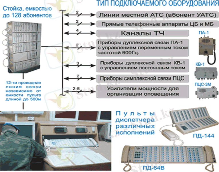 Диспетчерлік пульт диспетчердің жұмыс орындарын ұйымдастыруға арналған. Диспетчерлік пульт: тағайындалған абоненттердің жағдайын көзбен бақылау, кез келген абонентті немесе абоненттер тобын шақыру, бір түймені басу, қосылыстарды басқару (араласу, басқа пультке беру) .