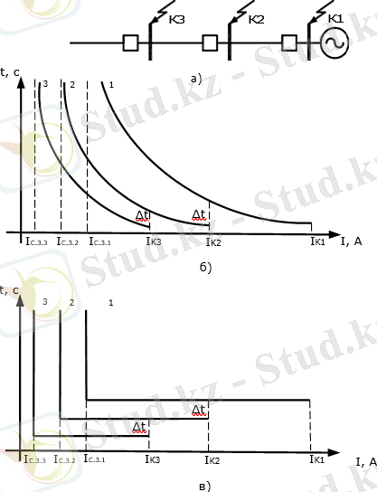 1. 3-суретте желінің бөлімі және ток күшінен қорғаныстың уақыттық сипаттамалары көрсетілген. Суреттен көруге болады, тәуелді уақыт-ток сипаттамалары бар асқын токты қорғауды қолданған кезде, қысқа тұйықталу тогы ең жоғары К1 нүктесіндегі қысқа тұйықталу қысқа уақыт кідірісімен ажыратылады.