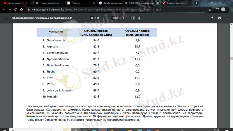 Қазақстандық нарықта ұсынылған он ірі шетелдік фармацевтикалық компаниялардың қатарына жатады келесі: