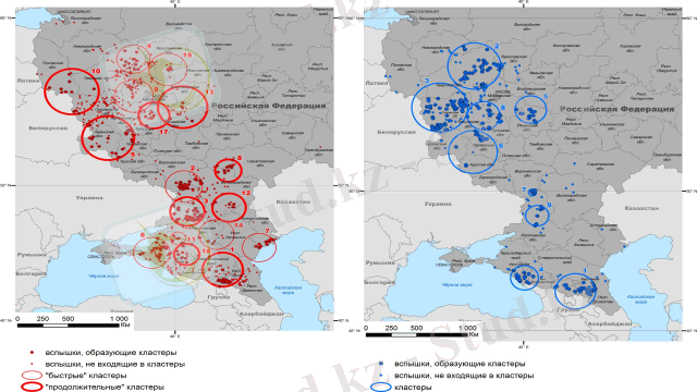 1-сурет. Ресей Федерациясының еуропалық бөлігіндегі жабайы қабандар (оң жақ) мен үй шошқалар арасында ( сол жақ) таралған африкалық шошқа обасының анықталған кластерлері