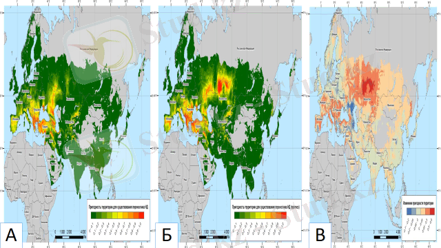 Б. Климат өзгерген жағдайдағы нодуллярлы дерматиттің болжам ретіндегі нозоареалының картасы В. Климат өзгерген жағдайдағы Евразиядағы нодуллярлы дерматиттің болжам ретіндегі нозоареалының Б суретімен салыстырмалы картасы