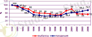 Сурет 1 Өнеркәсіп өндірісі өнімдерінің физикалық көлемі мен атмосфераны ластаушы заттар қоқыс-қалдықтарының индексінің өзгеру динамикасы