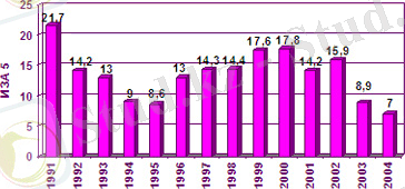 Сурет 4. Өскемен қаласы бойынша атмосфераның ластану индексінің 1991-2003 жж. өзгеру динамикасы