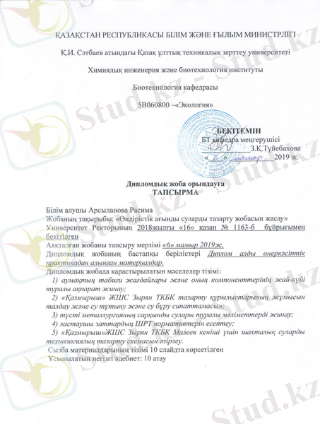 АННОТАЦИЯВ дипломной работе рассмотрены вопросы предоставления наиболее эффективного метода технологической очистки шахтных вод Малеевского рудника ЗГОК ТОО «Казцинк».