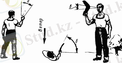 б) лақтыру бұрышының бағыты қарсы желге байланысты.