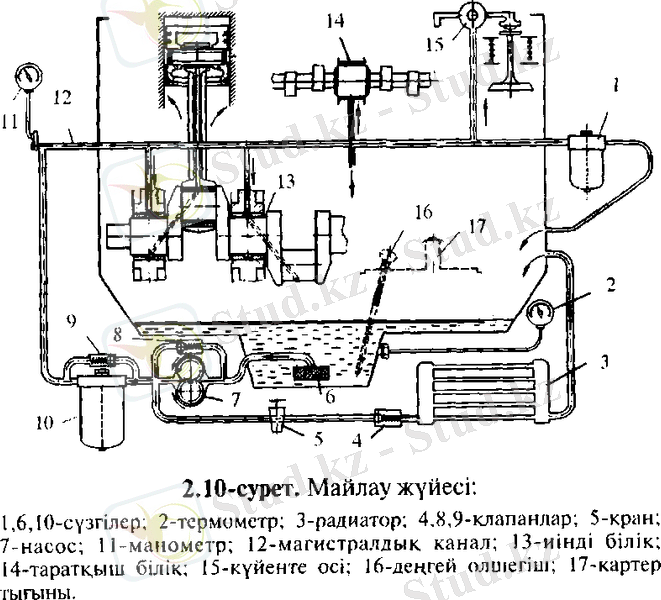 1, 6, 10-сүзгілер: 2-термометр; 3-радиатор; 4, 8, 9-клапандар; 5-кран; 7-насос; 11-манометр; 12-магистралды канал; 13-иінді білік; 14-таратқыш білік; 15-күйенте ось; 16-деңгей өлшегіш; 17-картер тығыны