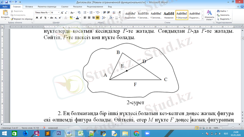 Шыныңда да Ғ екі өлшемді дөңес жазық фигура болса онда анықтама бойынша оның берілген түзуде жатпайтын кемінде 3 нүктесі болады. Олар А, В, С болсын, 1. 2 суретіне сәйкес. Е үшбұрыштың кез-келген бір ішкі нүктесі болсын
