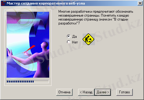 6) Экранда «В стадии разработки» батырмасын көрсетуге болатын сұхбаттық терезе шығады (9-сурет) . «Жоқ» батырмасын ағымды етіңізде «Далее» батырмасын шертіңіз;