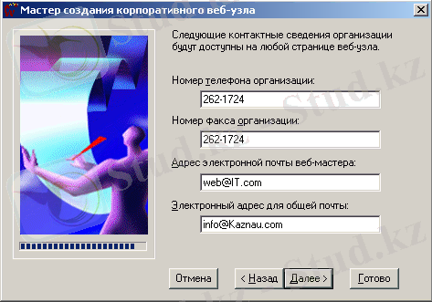 8) Келесі сұхбаттық терезеде web-шеберге және басқа да сұрақтар үшін қажет болатын телефон, факс нөмірлерін және электрондық пошта адрестерін енгізіңіз. Суретте көрсетілген мәліметтерді енгзіңіз және «Далее» батырмасын басыңыз (11-сурет) ;