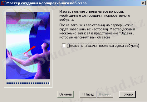 9) Экранда жұмыстың сәтті аяқталғандығын мәлімдейтін шебердің соңғы сұхбаттық терезесі шығады. «Показать «Задачи» после загрузки веб-узла» өрісіндегі қанатбелгіні алып тастаңыз және «Готово» батырмасын шертіңіз (12-сурет) ;