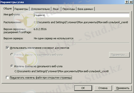 Мүмкін болса сайттың үнсіздік бойынша берілген атауын арнаулы атауға өзгерткен дұрыс. Ол үшін «Сервис→Параметры узла» командасынан кейін шыққан сұхбаттық терезенің «Общие» бөліміндегі «Имя веб-узла» қатарында қажетті атауды көрсетеміз және «Применить», «ОК» батырмаларын шертеміз (13-сурет) .
