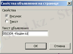 Web-бет пунктирлі сызықтармен бірнеше бөліктерге бөлінген. Жоғарғы қатарда навигациялық мәзір орналасқан. Ол сайттың негізгі бөлімдеріне ауысуға мүмкіндік береді. Қазіргі жағдайда навигациялық бөлім - бір ғана «Домашняя» сілтемесінен тұрады. Келесі қатарда «Домой» атауымен тақырып бөлімі орналасқан. Тақырып атауын өзгерту үшін тінтуірдің сол жақ батырмасымен бөлімде үздіксіз екі рет шерту керек. Ашылған «Свойства обьявления на странице» сұхбаттық терезесіндегі «Текст обьявления» өрісінде қажетті тақырып атауын, мысалы «050304 -Кеден ісі мамандығы» енгіземіз және «ОК» батырмасын шертеміз. Жаңа тақырып атауы веб-беттің жоғарғы бөлігінде орналасады (18-сурет) .