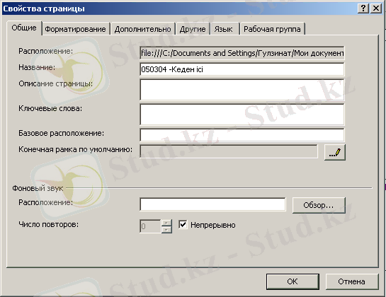 1) Бос аймақта жанама мәзірден «Свойства страницы» командасын таңдаймыз. Ашылған сұхбаттық терезеден «Общие» бөлімін ағымды етеміз «Название» қатарында веб-бетті көру барысында шығатын мәтінді енгіземіз (19-сурет) ;