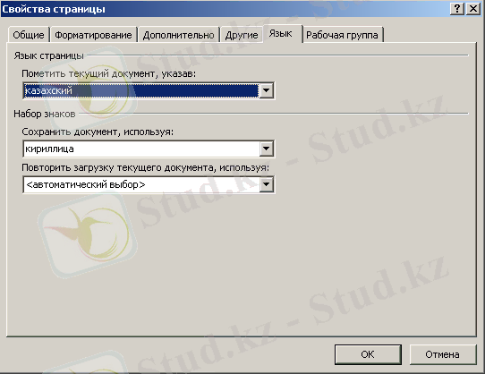 20-сурет. «Свойства страницы» командасының «Язык» бөлімі.
