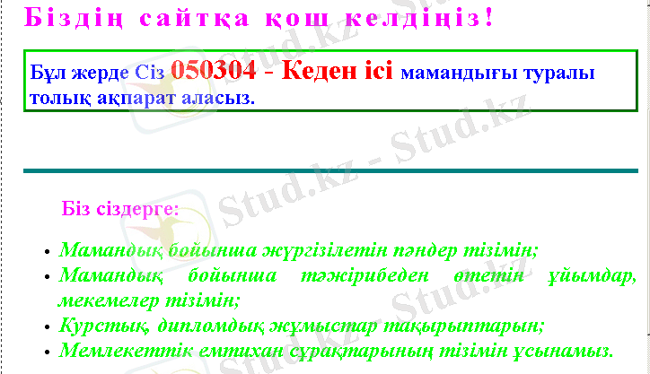 Өзіміздің мамандығымыз туралы сайт құру жолын «Мастер создания корпоративного Web-узла» шаблоны көмегі арқылы қарастырайық: