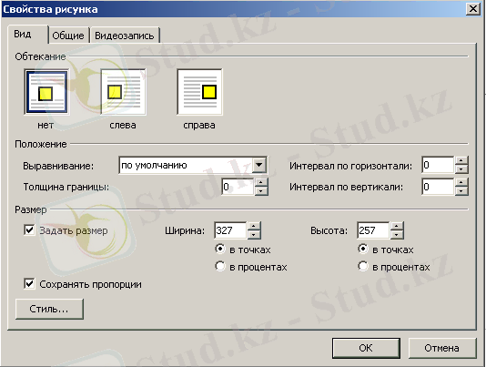 Жанама мәзірдің «Свойства рисунка» қасиетінен кейін шығатын сұхбаттық терезеде бейненің қасиеттерін өзгертуге болады (40-сурет) ;