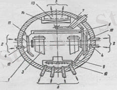 2. 1 - суретте қазан барабанында 15, 2 МПа қысымы бар қуатты бір барабанды қазандардың ішкі барабандық қондырғыларының орналасуы көрсетілген. Бу жуғыш қондырғылар барабан 1 ішінде орналасқан. Бу - сулы қоспа жеткізгіш құбырлар 2 арқылы ішкі барабанды циклондарға 3 арнаулы қорабтар 4 көмегімен әкелінеді. Циклондарда сепарацияланған бірінші сатысы орындалады. Циклоннан шыққан бу бу жуғыш қондырғының тесіктерінен өтіп, жуушы судың қабаттарында барботаждалады да буды шығарып алып кетуші 5 құбырларға барады. Жуғыш қондырғы дегеніміз - ол барабанның көлденең қимасын керме бойынша толық қамтитын жалпақ, кереге көз 6 темірден жасалынған қалқан. Қоректік су (50% шамасында) арнаулы таратқыш құбыр 7 арқылы осы тесік қалқанға әкелінеді. Қоректік судың қалған мөлшері таратқыш құбырлар 9 көмегімен төмен түсіргіш құбырға 8 жіберіледі. Төмен түсіргіш құбырлар барабанның жалпы кеңістігінен қорғағыш қорабтар 10 арқылы бөлінеді. Тесік қалқаннан суды құйып алу екі жақтан бірдей арнаулы нығыздаушы гидрожапқыштар 11 мен төгетін құбырлар 12 арқылы жүргізіледі. Барботаждаушы кереге кез қалқанның тесіктерінің өлшемі мен тесіктерден өтетін бу жылдамдығын, табақ бетінде буды жуатын суды 40 - 50 мм қалыңдықта ұстап тұра алатындай етіп алу қажет. Тесік қалқанды жуатын суға пайдаланғанда “өткізбейтін” құламайтын болып табылады, яғни қалқан тесіктерінен су өтпейді. Жуғыш буды құрғату жуғыш қалқанның үстінде, бу кеңістігінде жүргізіледі. Буды шығарып алып кетуші құбырлардың 5 алдында әрқашанда тесігі бар бу қабылдағыш төбе 13 орнатылады, ал кейде оның алдынан терезе жапқыштар (жлюздер) 14 орнатылады.