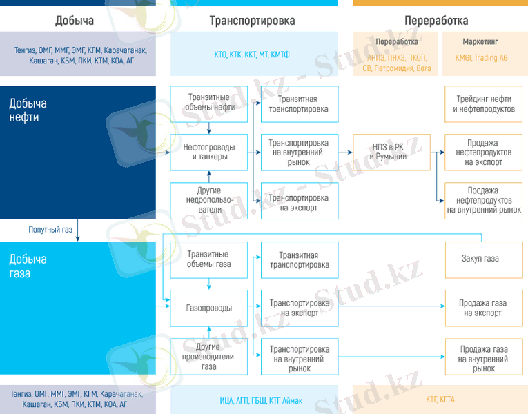 «ҚазМұнайГаз» ҰК АҚ Қазақстанда мұнай және газ конденсатын өндірудің жалпы көлемінің 28% өндіреді, табиғи және ілеспе газдың - 16% өндіреді, магистральды мұнай құбыржолдарымен мұнайдың 65% тасымалдануын қамтамасыз етеді, Ақтау портынан танкерлермен мұнай тасымалдаудың 77%, сондай-ақ магистральды газ құбыржолдарымен табиғи газдың 95% тасымалдануын қамтамасыз етеді, қазақстан мұнайының 82% өңдеуді жүзеге асырады, мұнай өнімдерінің блшек сауда нарығындағы үлесі - 17%.
