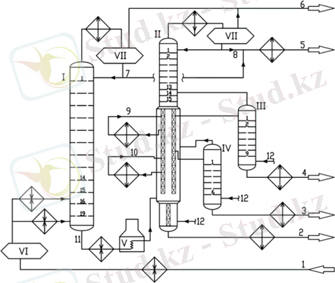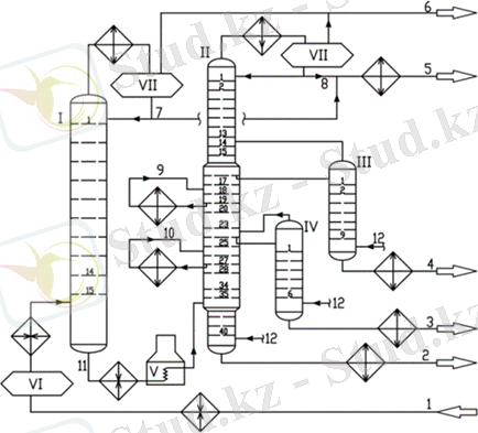 I - К-1 бензин алу бағаны; II - К-2 ректификациялық баған; III - жеңіл атмосфералық газойлды шығарудың стриппинг-секциясы. IV - стриппинг-ауыр атмосфералық газойлды шығару секциясы; V - құбырлы пеш; VI - электродегидратор; VII - флегмалық ыдыс; 1 - шикі мұнай; 2 - мазут; 3 - ауыр атмосфералық газойль; 4 - жеңіл атмосфералық газойль; 5 - бензин фракциясы; 6 - көмірсутекті газ; 7 - К-1 бағанының бензині; 8 - К-2 бағанының бензині; 9- АЦС-1 аралық циркуляциялық сұйытылым; 10 - АЦС-2 аралық циркуляциялық сұйытылым; 11 - бензин алынған мұнай; 12 - су буы