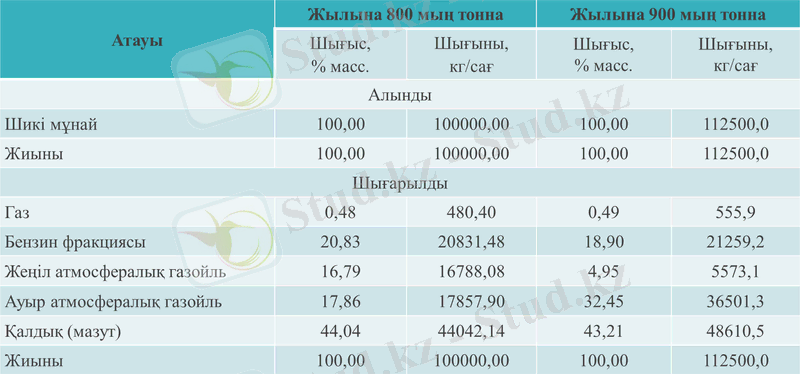 Жаңғыртылатын қондырғыда жылына 800 және 900 мың тонна шикі мұнайды қайта өңдеудің материалдық балансы 1-кестеде келтірілген.