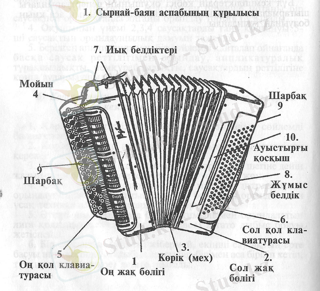 3) Оң және сол жақ корпустарын жалғастырып тұрған қатарлардан (мех) тұрады. Осы 2 корпусын жалғастырып тұрған қатпарлар арқылы біз келген музыкалық дыбыстарды қатты немесе жай етіп шығарып ести аламыз. Баянда дыбыс шығарылу кнопкалардың металл тілдерін қатпар арқылы жіберілген ауа қысымының кұшімен шыққан дыбысты ести аламыз. Аспап ерекше күтімді талап етеді. Жаңбырлы, суық күндері арнайы жабық футлярда ұстаған жөн. (Cурет 1)