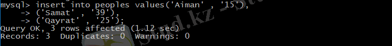 Біз бос кесте құрадық. Енді бұл кестені толтыру керек. Бұл үшін insert into my_table values( 'аты', 'жасы' . . . ) ; командасын қолданамыз: