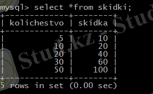 create table skidki(kolichestvo int(10), skidka int(20) ) ;