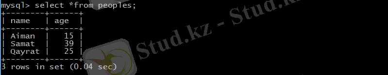 Суретте көрсетілгендей осы кестеге үш адамның аты мен жасың енгіздік. Кестені мониторға шығару үшін select *from my_tables; командасын қолданамыз: