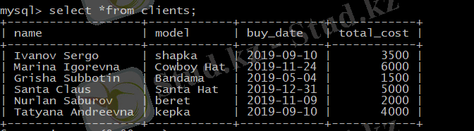 -> ('Marina Igorevna', 'Cowboy Hat', '2019-11-24', '6000'),