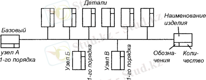 - негізгі бөлікті және жиналған өнімді білдіретін тіктөртбұрыштар түзу сызықпен жалғанады;