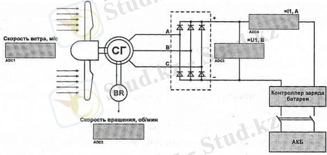 Құлаушы желдеткіш асинхронды электр қозғалтқыш арқылы іске қосылады, ол кернеуді инвенторлы типті жел жылдамдығының береліс блогында орналасқан жиілік түрлендіргішінен алады (суретте көрсетілмеген) . Синхронды генератор статоры (А, В, С фазалары) «Түзеткіш» модуліне (А, В, С клеммаларына) қосылады. «Түзеткіш» модулінің тұрақты ток шиналарына «+» және «-» өлшеуіштік аспаптар қосылған, олар түзеткіштің шығысындағы ток және кернеуді өлшейді.