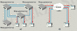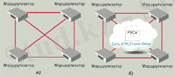 Жақында Frame relay және ATM технологиялары "толық байланысқан желіні"құру кезінде бөлінген желілерге балама ретінде қарастырыла бастады. Осы технологияларға сәйкес қосылу маршрутизатордан тірек желісіне бөлінген арналарды құруды, содан кейін коммутациялық "бұлттан" басқа маршрутизаторларға тұрақты виртуалды арналарды (тұрақты виртуалды арна - PVC) құруды қамтиды. - Сур. 1, B Frame relay немесе ATM" бұлт " арқылы біріктірілген төрт маршрутизатордан тұратын қарапайым желіні көрсетеді. Алайда, мұндай желілерде бірқатар кемшіліктер бар, олар өз кезегінде интернеттің қарқынды дамуына байланысты олардың мөлшері өскен сайын көрінеді.