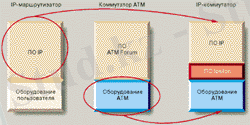 IP-маршруттау ATM коммутаторларын басқаратын Ipsilon бағдарламалық жасақтамасының көмегімен ATM коммутациялық жабдығының үстінен жүзеге асырылуы мүмкін;