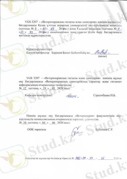 Қазақ ұлттық аграрлық зерттеу университеті. Ветеринариялық гигиена және санитария пәнінің оқу-әдістемелік кешені (6В09101 - Ветеринариялық медицина), 3-курс, 5-семестр, Алматы, 2021