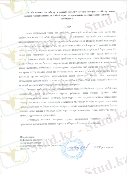 Ғылыми жобаның жалпы сипаттамасы. Біздің зерттеу нысанасына алған ғылыми жобамыздың тақырыбы «Абай қара сөздері оқушы көзімен » деп аталады. Қазақ дүниетанымында Абай Құнанбайұлының алатын орны айрықша. Абай: «Ақынның азаматтық парызы шындықты бейнелеуде, қоғамдық кесірді әділет пен ақылды билігіне жүгіндіруде» деп білді. «Абай іліміндегі қара сөздерінің алатын орны қандай?» деген сауал төңірегінде ізденіс жүргізер болсақ, ақынның жалпы шығармашылығының өзі - адамгершілік пен ізгілік қасиеттер бастауынан тұратындығын байқаймыз.