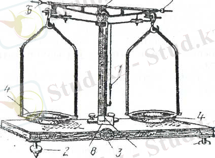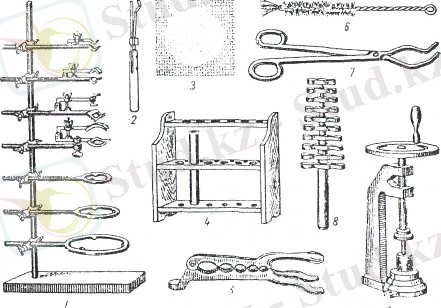 5-сурет. 1-штатив; 2- пробирка тұтқыш; 3-асбес торы; 4-Пробирка салатын штатив; 5-тығынды қысқыш; 6-сүмбі-шетка; 7-тигель қысқышы; 8-тығын тескіш бұрғьшар жинағы; 9-тығынтескіш аспап.