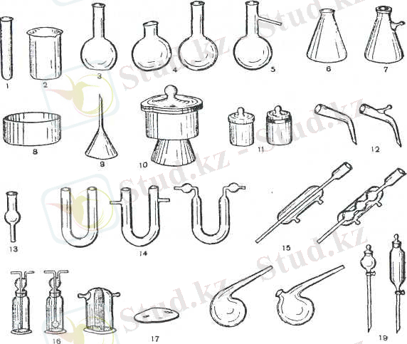 Сурет-3 . (жоғарғы) Шыны ьідыстар :пробирка-1, стакан-2, түбі жалпақ колба-З дөңелек түпті колбалар-4, Вюрц колбасы-5, бүйірлі колба-6, фильтратты бөлуге арналған жанында өсіндісі бар-7, кристалдаткыштар-8, құйғыш - 9, эксикатор - Ю, бюктер-11, аллонждар-12, хлоркалышйлық тұтіктер-13, 1] -тәрізді тұтік-14, мұздатқыш-15, шайқағыш және кептіргіш шыны ыдыстар-16, сағат шьінысы-47, рсторталар-18, тамшылатып құйғыштар-19.