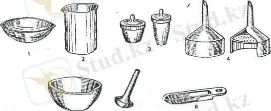 Сурет-4 (төменгі) Фарфор ыдыстар: тостақан-1; стакан-2; тигель қақпағымен (отқа тозімді ыдьіс) -3; Бюхнер құйғышы-4; келі мен түйгіш-5-қасық-6.