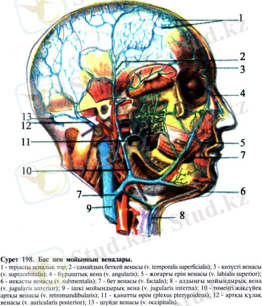 Бассүйекішілік веналарына (сурет 199, А) : 1. ми веналары (w. cerebri) үлкен ми сыңарларынан қан жинайды. Олар беткі және терең болып бөлінеді. Мидың беткі веналары дорсо-латералді, медиалді және базалді бетімен үлкен ми сыңарларынан және мишықтан қан жинайды. Олар мидың төменгі және жоғарғы веналары (vena cerebri media superficiales) мишықтың жоғарғы және төменгі веналары (w. сегеЬеШ) . Мидың терең веналары жарты шарларының ақ затынан миды құраушы ядроларынан, қарынша қабырғалары мен мидың тамырлары түйінінен қан жинайды. Оларға негізгі қалаушы венасы (vena basilaris), мидың алдыңғы веналары (w. anteriores cerebri) көру төмпешігінің ішкі және жолақты дененің веналары (w. thalamastriate superiores et inferiores), мидың ішкі ееналары (w. internae cerebri), мидың үлкен венасы (vena cerebri magna), мидың жұлын бөлігінің веналары (w. pontis) сопақша мидың веналары (vv. medulla oblangata) ; 2. менингеалді веналар (vv. miningeae) мидың қабықтарынан; 3. сүйекішілік немесе бассүйектің диплоидты веналары (w. diploicae) бас сүйектен, осы кезде сүйекішкі веналарының бір бөлігі мидың қатты қабығының қойнауына құяды, келесісі - веналық түтіктері арқылы бастың сыртқы жамылғысының веналарымен байланысады; 4. көз веналары (w. ophtalmicae) көз шарасынан, көзжас безінен, қабақтан, мұрын қуысынан, маңдай бөлігі мен сыртқы мұрыннан өтеді; 5. ішкі құлақ веналары, ұлудан қан жинайды.