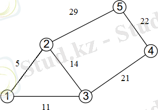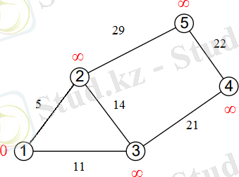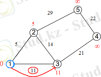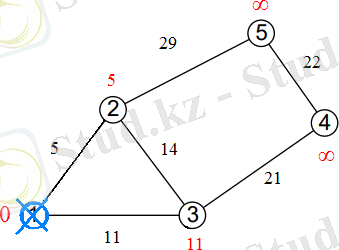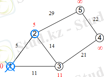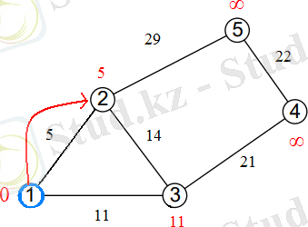 Кезек бойынша 1- ші шыңның көршісі - 2 шың, яғни оған дейінгі арақашықтық ең аз (5) . Сонымен қатар жолдың ұзындығы 1 шыңына дейін қысқарақ болып табылады, яғни 0+5=5. Бұл мән ағымдағы 2-ші шыңның белгіленуінен аз, ∞>5, сондықтан 2-1 шыңдарының белгіленуі 5 тең (2. 5 сурет) .
