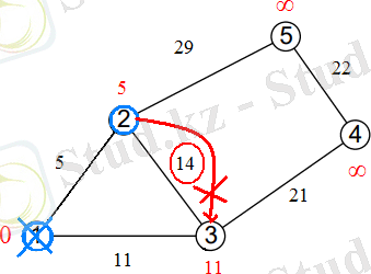 Екінші шың арқылы өтіп, таңдалған шыңның көршілерінің белгіленуін қайтадан кішірейтуге тырысамыз. 3 және 5 2-ші шыңның көршілері болып табылады. Кезек бойынша 1-ші шыңның көршісі - 2 шың, бірақ ол қарастырылғандықтан бірінші шыңмен ештеңе жасамаймыз. Келесі көрші бұл 3-ші шың (11) -шыңның ішіндегі ең кіші белгіленуде болғандықтан, яғни ол шыңдардың арасында қарастырылмайды. Егер оған 2-ші шың арқылы баратын болсақ, яғни оның ұзындығы осындай болады: 19 (5+14) . Бірақ ағымдағы шыңның 3-ші белгіленуі 11 < 19, сондықтан белгіленуі өзгермейді.